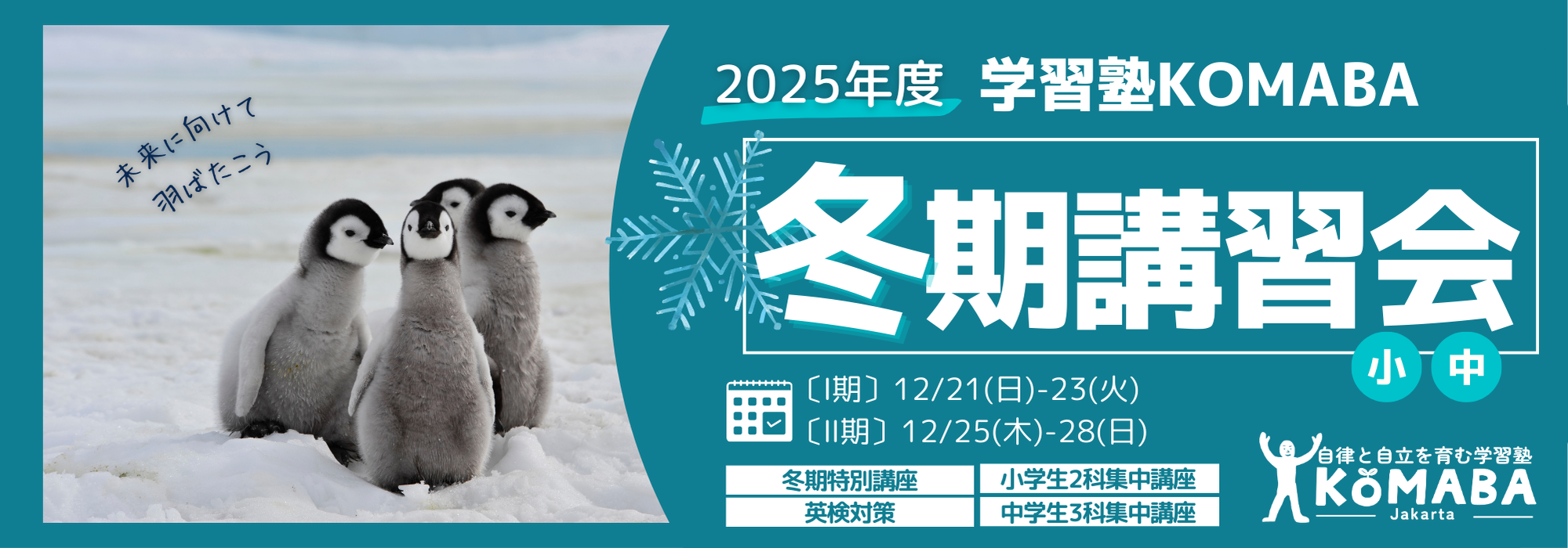 学習塾KOMABAでは以下の通り冬期講習会を実施いたします。 一部の学年と期間で一時帰国によるオンライン参加も可能です。 詳しい資料はページ下部よりご請求いただけます。どうぞお気軽にお問い合わせください。